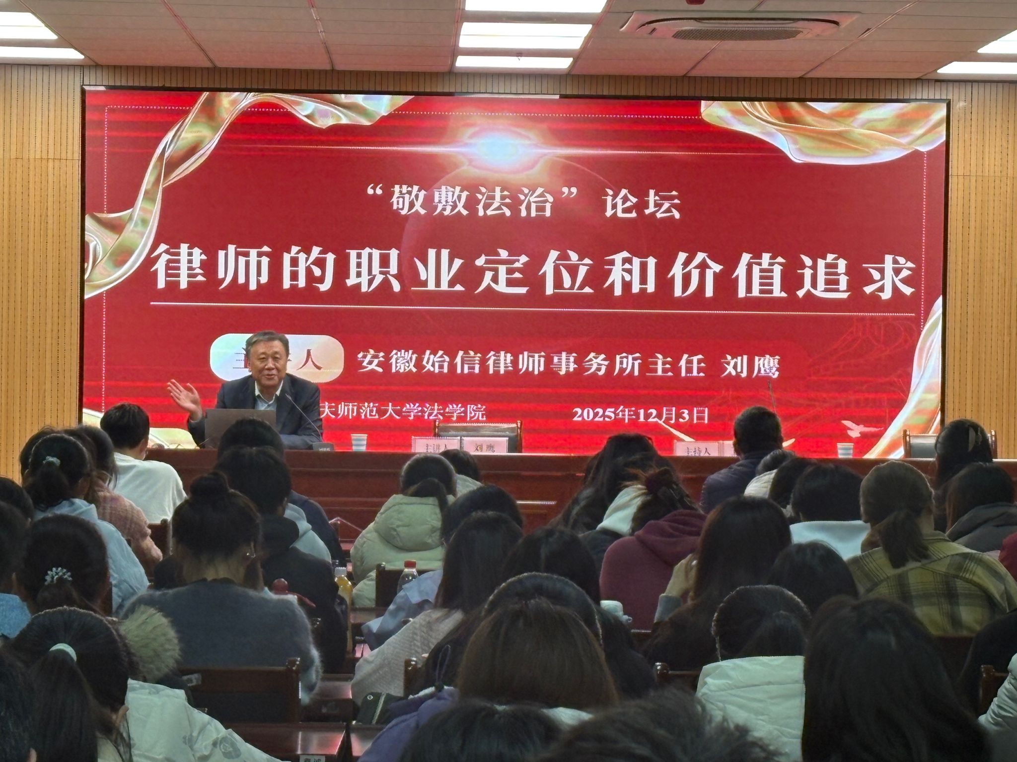 报告伊始,刘鹰以“时间轴”方式回顾了我国律师制度的发展脉络,结合自身30余年执业经历,用“小案件”讲“大道理”,从“技术—伦理—信仰”三个维度剖析了律师职业的多重角色。他指出,在全面依法治国背景下,律师不仅是当事人合法权益的维护者,更是社会主义法治的建设者、社会公平正义的促进者;律师执业“三分靠法律,七分靠情怀”,既要精通条文,更要“带着情感、带着温度、带着责任”去服务社会。刘鹰寄语青年学子:把“纸面上的法”变成“行动中的法”,把“冷冰冰的条文”变成“温暖的正义”,在未来道路上始终坚守法治信仰、践行社会责任。报告中,刘鹰还介绍了安徽始信律师事务所的成立和发展情况,就法学专业毕业生的就业形势和毕业选择给予指导。
