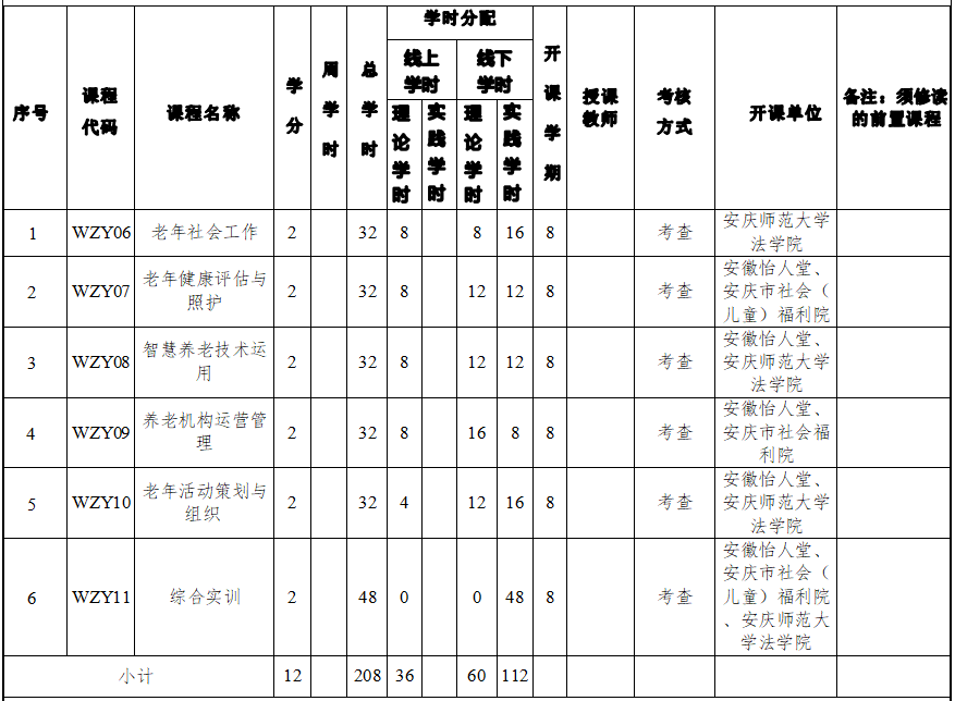 上课地点:太阳成tyc7111cc校内理论课堂+校外安徽怡人堂旗下养老机构、社区养老服务站、安庆市社会(儿童)福利院等实践基地。